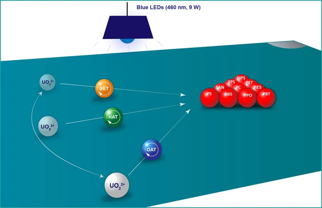 以六水合硝酸铀作为光敏剂,在460纳米蓝光照射下,聚苯乙烯可以30%的分离产率获得苯甲酸;聚苯乙烯泡沫可以40%产率降解为苯甲酸;高抗冲聚苯乙烯(HIPS)可以32%的收率降解为苯甲酸。公斤级真实聚对苯二甲酸乙二醇酯(PET)瓶(未清洗、含水、色素、黏合剂、添加剂)能够在2天内以88%的产率降解为对苯二甲酸。